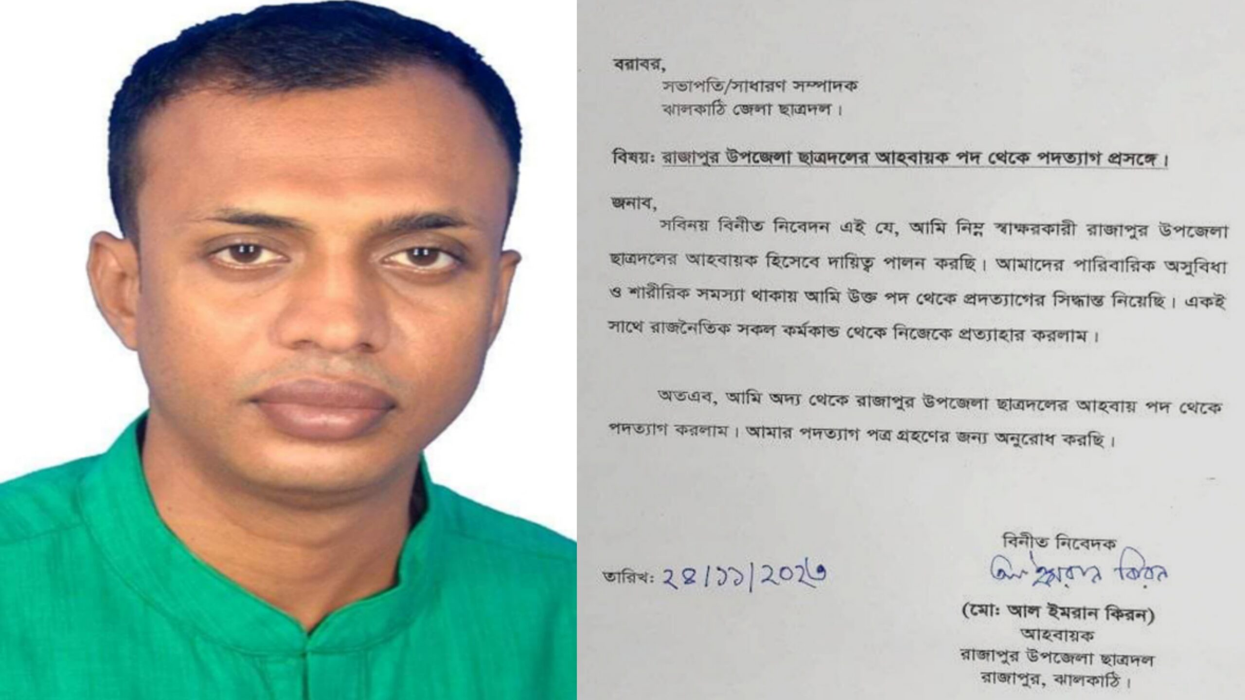 ঝালকাঠির রাজাপুর উপজেলা ছাত্রদলের আহবায়ক আল ইমরান কিরন দলীয় পদ থেকে পদত্যাগ এবং দলের সকল কার্যক্রম থেকে অব্যাহতি নিয়েছেন। ২৪ নভেম্বর সন্ধ্যায় তার নিজ ফেসবুক ওয়ালে পদত্যাগপত্রের কপি আপলোড করে স্ট্যাটাস দিয়ে এই বিষয়টি নিশ্চিত করেছেন আল ইমরান কিরন।