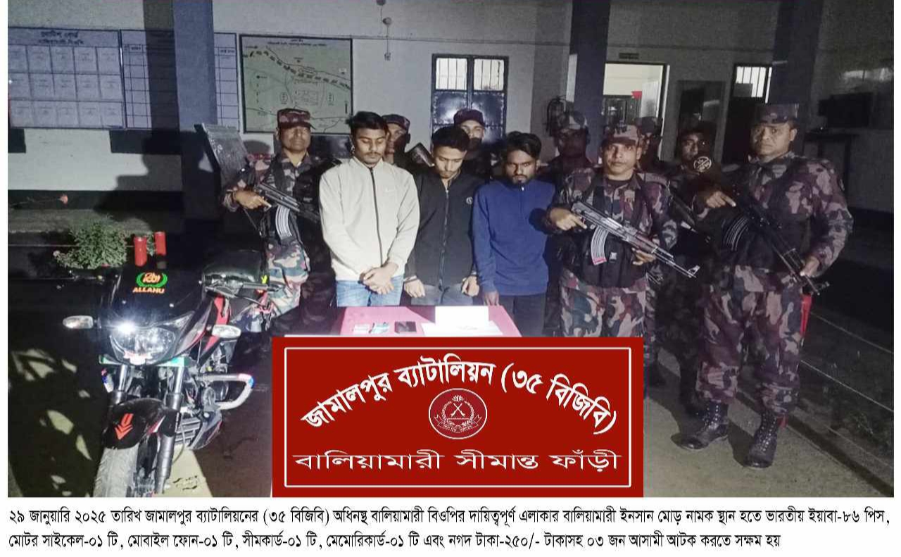 পুলিশ জানায়, গোপন সংবাদের ভিত্তিতে বাংলাদেশের অভ্যন্তরে বালিয়ামারী ইনসান মোড় নামক স্থান অভিযান চালিয়ে তিন মাদক কারবারিকে গ্রেপ্তার করেছে বিজিবি। এসময় তাদের থেকে নগদ ২৫০ টাকা, ভারতীয় ইয়াবা-৮৬ পিস, একটি মোটর সাইকেল, মোবাইল ফোন ১টি, সীমকার্ড ০২ টি ও একটি মেমোরি কার্ড উদ্ধার করা হয়।