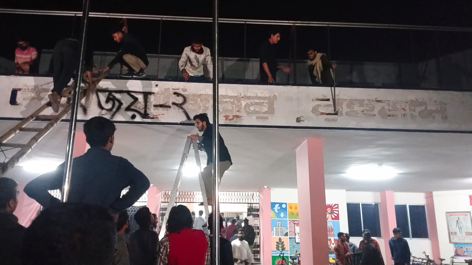 সরেজমিনে দেখা যায়, রাত ৯টা বাজতেই দলে দলে বিক্ষুব্ধ শিক্ষার্থীরা বিশ্ববিদ্যালয়ের জোহা চত্বরে অবস্থান নেয় এবং বিক্ষোভ মিছিল করে।পরবর্তীতে বিক্ষুদ্ধ শিক্ষার্থীরা বঙ্গবন্ধু শেখ মুজিবুর রহমান হলের সামনে উপস্থিত হয়। পরে তারা হলটির নামফলক, উদ্ভোদনী ফলকসহ শেখ মুজিবের চিহ্ন সম্বলিত স্থাপনাগুলো ভেঙে দেয়। এ সময় তারা হলটির নতুন নাম ‘বিজয় ২৪’ রাখেন। পরে রাত পৌনে ৯টার দিকে তারা নির্মানাধীন এ এইচ এম কামারুজ্জামান হলেরও নামফলক ভেঙে ফেলেন। হলটির নতুন নাম দেয় ‘শহীদ রায়হান হল’। পর্যায়ক্রমে শেখ হাসিনা হলের নাম ভাঙচুর করে ফাতেমা আল-ফিহরিয়া ও শেখ ফজিলাতুন্নেছা হলের নাম ‘নবাব ফয়জুন্নেসা চৌধুরানী’ এবং আন্দোলনের শেষে শেখ রাসেল মডেল স্কুলের নামফলকও ভাঙচুর করে ‘রিয়াগোপ মডেল স্কুল।