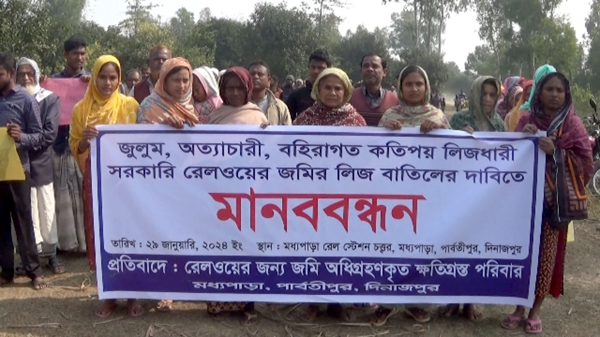 দিনাজপুরের মধ্যপাড়া কঠিন শিলা খনি থেকে পাথর পরিবহনের প্রয়োজনে নির্মিত রেলা লাইনের জায়গার অধিগ্রহনের টাকা এখনও না পাওয়ায় ও পরিত্যাক্ত রেল স্টেশনের জমি বহিরাগতরা লিজ নিয়ে মাদক ও দেহ ব্যবসা পরিচালনার করছেন। এমন অভিযোগ এনে গত (২৯ জানুয়ারী) সোমবার দুপুর ১২টায় মধ্যপাড়া (খাগড়াবন) এলাকায় স্থানীয় এলাকাবাসীরা ঘন্টা ব্যাপী মানববন্ধন করেছেন।