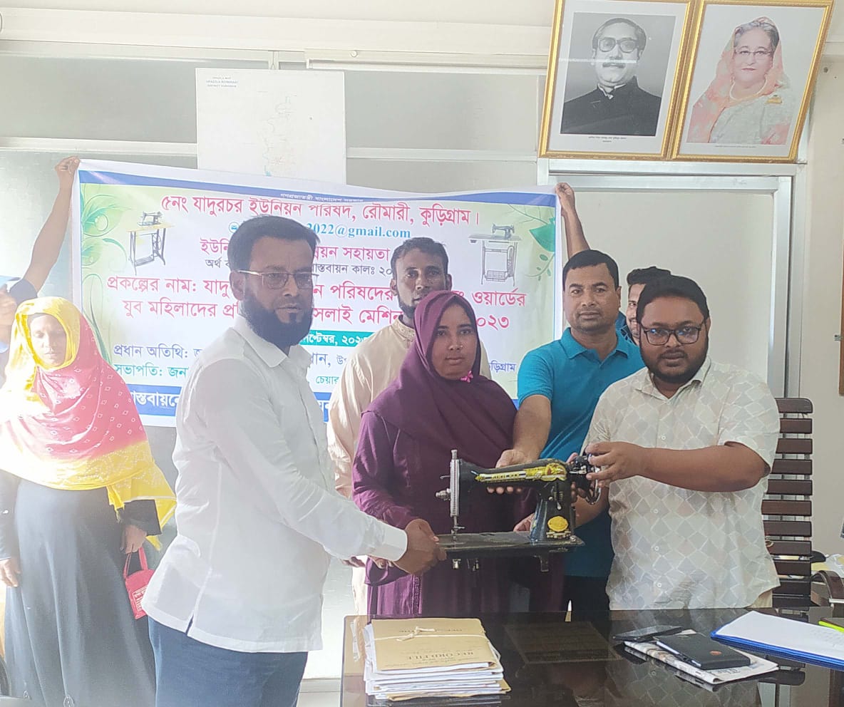 রৌমারী(কুড়িগ্রাম)প্রতিনিধিঃকুড়িগ্রামের রৌমারী উপজেলায় জাতীয় স্থানীয় সরকার দিবস উপলক্ষে ১৫ জন দু:স্থ মহিলার মাঝে সেলাই মেশিন বিতরণ করা হয়েছে। মঙ্গলবার দুপুরের দিকে ইউনিয়ন পরিষদ উন্নয়ন তহবিল থেকে ও উপজেলা প্রশাসনের আয়োজনে যাদুরচর ইউনিয়ন পরিষদের সার্বিক ব্যবস্থাপনায় ১৫ জন দু:স্থ মহিলাদের মাঝে আত্মকর্মসংস্থানের লক্ষ্যে ১৫টি সেলাই মেশিন বিতরণ করা হয়। এসময় প্রধান অতিথি হিসেবে উপস্থিত ছিলেন উপজেলা নির্বাহী অফিসার নাহিদ হাসান খান। এছাড়াও উপস্থিত ছিলেন, উপজেলা আওয়ামীলীগের সাধারণ সম্পাদক আবু হোরায়রা,যাদুরচর ইউপি চেয়ারম্যান সরবেশ আলী,ইউপি সদস্য ফরমান আলী, জিয়াউর রহমান জিয়া, ময়নাল হক ও ইউপি সচিব মজিবুর রহমানসহ অনেকেই।