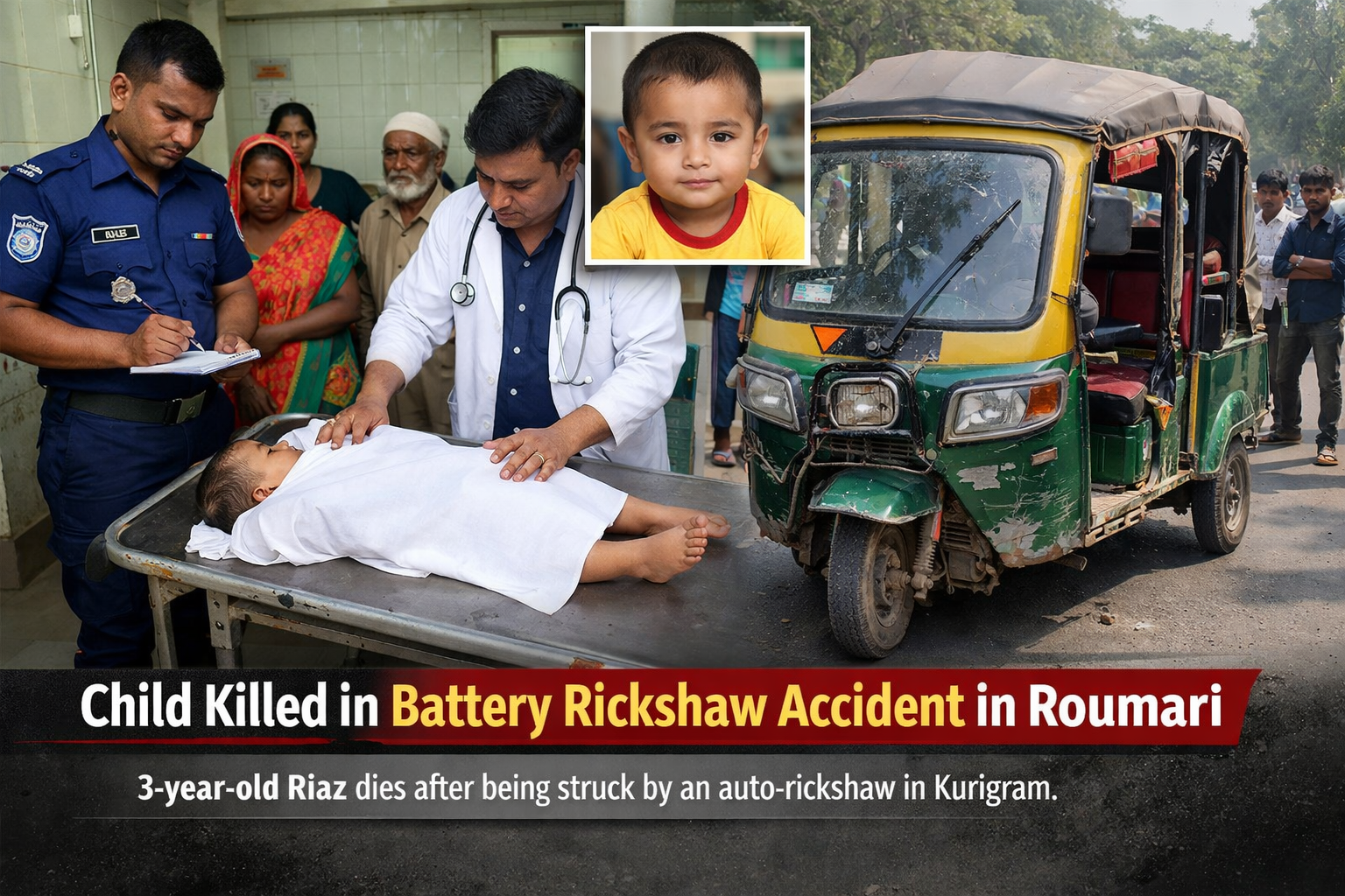 কুড়িগ্রামের রৌমারী উপজেলায় ব্যাটারিচালিত অটোরিকশার চাপায় মো.রিয়াজ (৩) নামে এক শিশু নিহত হয়েছে। ঘটনাটি ঘটেছে রৌমারী থানাধীন ০২ নং শৌলমারী ইউনিয়নের বাতার গ্রামে দাঁতভাঙ্গা–রৌমারীগামী ডিসি রোডের পাকা সড়কে।