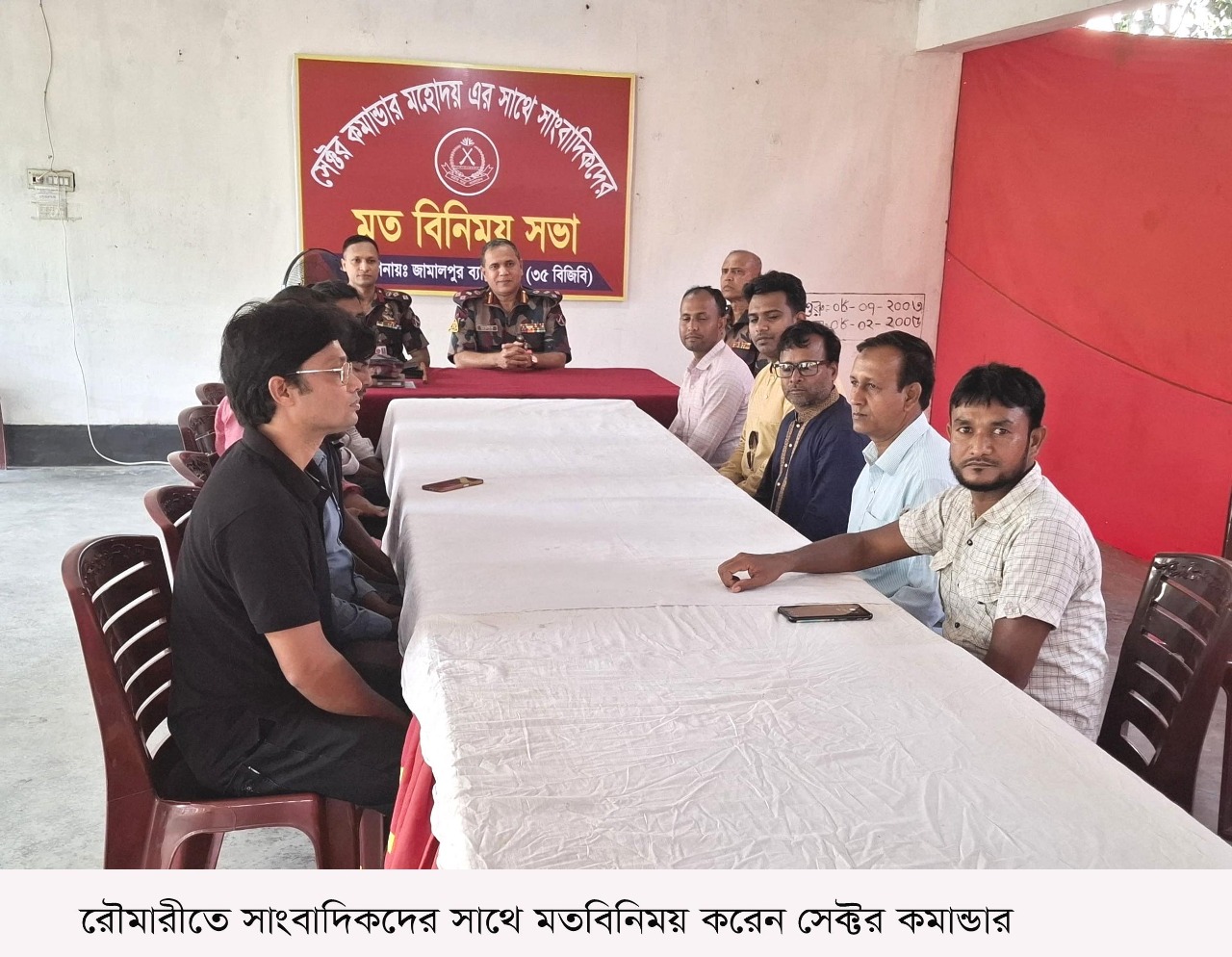 কুড়িগ্রামের রৌমারী উপজেলার দাঁতভাঙ্গা বিওপি ক্যাম্পে জামালপুর ৩৫ বিজিবি ব্যাটালিয়ন এর আয়োজনে উপজেলার বিভিন্ন প্রিন্ট ও ইলেকট্রনিক মিডিয়ার কর্মরত সাংবাদিকদের সাথে পিবিজিএমএস,পিএসসি, সেক্টর কমান্ডার ময়মনসিংহ কর্নেল সরকার মোহাম্মদ মোস্তাফিজুর রহমান ও জামালপুর ৩৫ ব্যাটালিয়নের পিএসসি অধিনায়ক লেঃ কর্নেল হাসানুর রহমান মত বিনিময় সভা করেন। শুক্রবার বিকালের দিকে উপজেলার দাঁতভাঙ্গা বিজিবি ক্যাম্পে এই মত বিনিময় সভা অনুষ্ঠিত হয়।