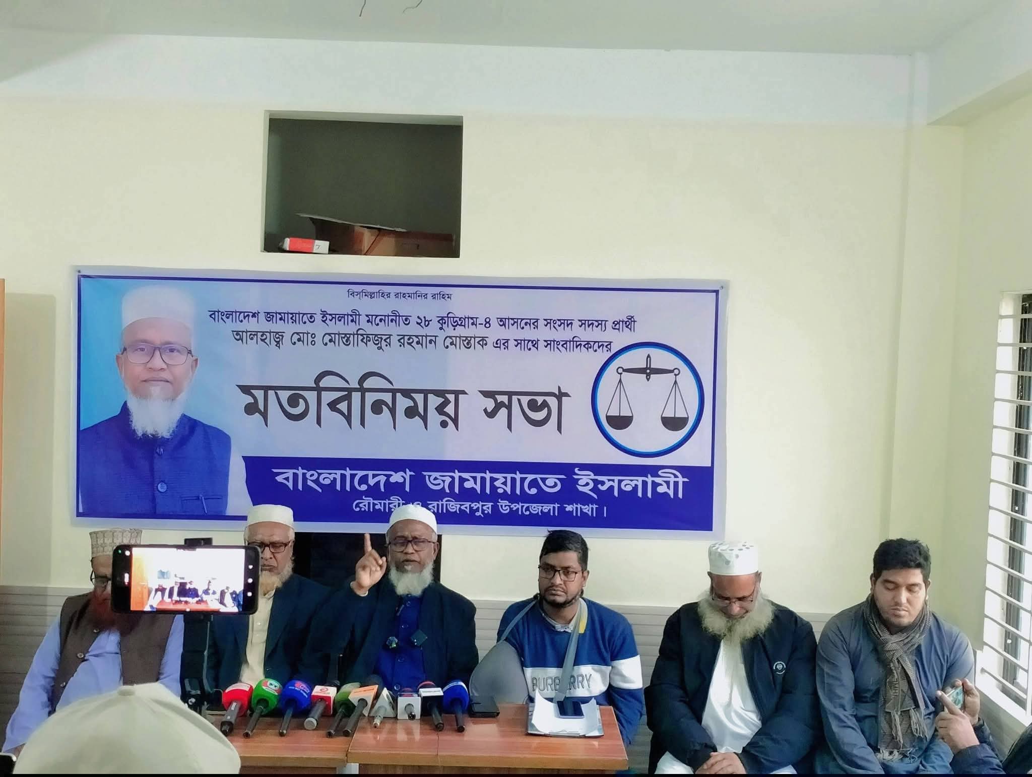 কুড়িগ্রাম-৪ (রৌমারী–রাজিবপুর) সংসদীয় আসনের এমপি প্রার্থী মোস্তাফিজুর রহমান মোস্তাক রৌমারী ও রাজিবপুরের সাংবাদিকদের সঙ্গে মতবিনিময় সভা অনুষ্ঠিত করেছেন। আজ মঙ্গলবার (২০ জানুয়ারি) সকাল ১১টা ৩০ মিনিটে রৌমারী উপজেলার যাদুরচর ইউনিয়নের আহাম্মদিয়া হাসপাতাল মিলনায়তনে অনুষ্ঠিত সভায় প্রিন্ট ও ইলেকট্রনিক মিডিয়ার প্রায় অর্ধশত সাংবাদিক উপস্থিত ছিলেন।