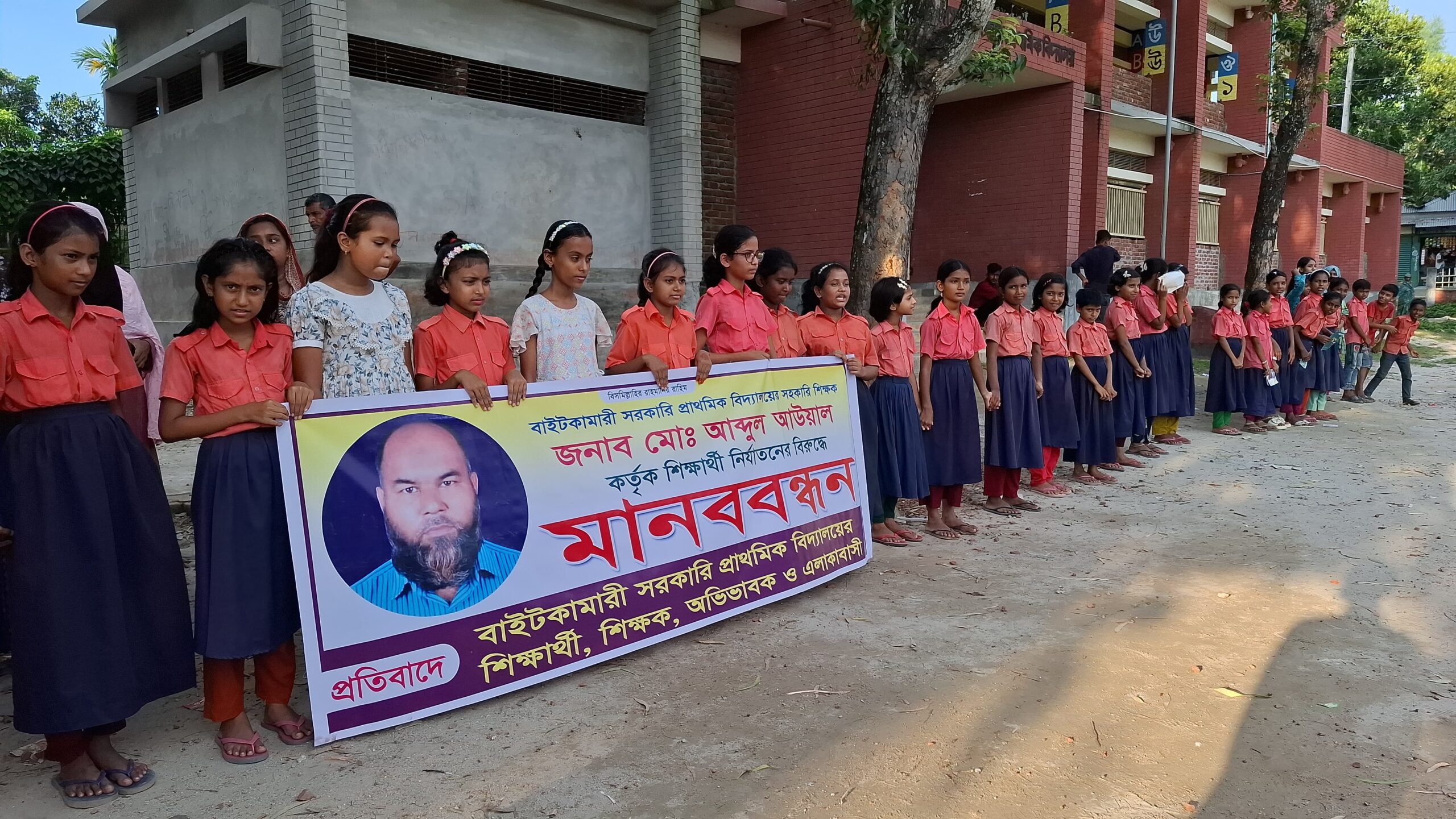 বৃহস্পতিবার (২৫ সেপ্টেম্বর) বিকেলে বিদ্যালয় চত্বরে আয়োজিত এ মানববন্ধনে বিদ্যালয়ের শিক্ষার্থী, অভিভাবক ও এলাকাবাসী অংশগ্রহণ করেন। বক্তারা অভিযোগ করেন, দীর্ঘদিন ধরে উক্ত শিক্ষক শিক্ষার্থীদের ওপর শারীরিক ও মানসিক নির্যাতন চালিয়ে আসছেন। এতে কোমলমতি শিক্ষার্থীরা আতঙ্কিত হয়ে পড়ছে এবং বিদ্যালয়ের স্বাভাবিক শিক্ষার পরিবেশ ব্যাহত হচ্ছে।