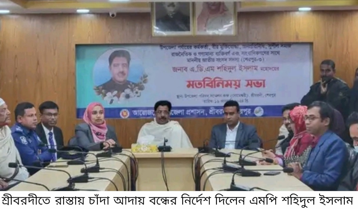 শেরপুরের শ্রীবরদীতে রাস্তায় চাঁদাবাজি বন্ধনের নির্দেশ দিয়েছেন শেরপুর-৩ আসনের নবনির্বাচিত সংসদ সদস্য এ.ডি.এম শহিদুল ইসলাম। এ নিয়ে খুশি এ উপজেলার গাড়ি চালকরা। মঙ্গলবার ১৬ জানুয়ারি উপজেলা পর্যায়ের কর্মকর্তা, বীর মুক্তিযোদ্ধা, জনপ্রতিনিধি, সুশীল সমাজ, রাজনৈতিক ও গণ্যমান্য ব্যাক্তিবর্গ এবং সাংবাদিকদের সাথে মতবিনিময় সভায় ওই নির্দেশনা দেন তিনি। উপজেলা প্রশাসনের আয়োজনে সম্মেলন কক্ষ সোমেশ্বরীতে অনুষ্ঠিত সভায় প্রধান অতিথি হিসেবে বক্তব্য রাখেন এ.ডি.এম শহিদুল ইসলাম এমপি। তিনি তার বক্তব্যে বলেন, শ্রীবরদী-ঝিনাইগাতীর মানুষ আমাকে ভোট দিয়ে নির্বাচিত করেছে তাঁদের কল্যাণে কাজ করার জন্য। আমি যতদিন বেঁচে থাকবো, ততদিন মানুষের কল্যাণে কাজ করবো।এসময় তিনি শ্রীবরদীর উন্নয়নে সকলের সহযোগিতা ও পরামর্শ কমনা করেন তিনি।
