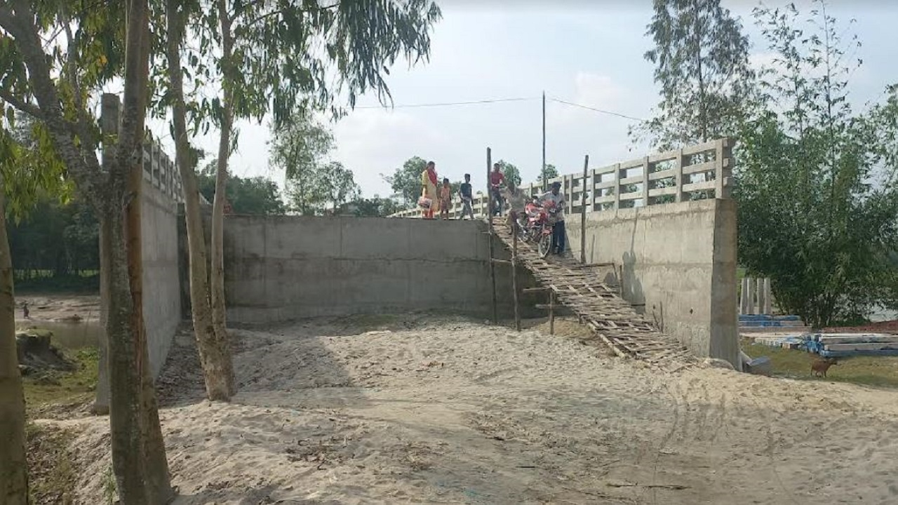 হাসানুজ্জামান হাসান,লালমনিরহাট: সেতু আছে কিন্তু সংযোগ সড়ক নেই। তাই ৭ কোটি টাকা ব্যয়ে নির্মিত সেতুতে উঠতে হয় বাঁশের সাঁকো বেয়ে। সেতু নির্মাণের এক বছর পেরিয়ে গেলেও ঠিকাদারি প্রতিষ্ঠান সংযোগ সড়ক নির্মাণ করেনি। এলাকাবাসী বাধ্য হয়ে নিজ উদ্যোগে বাঁশ দিয়ে তৈরি করেছেন সাঁকো।