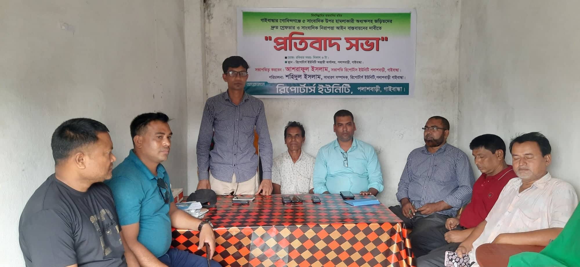 গাইবান্ধার গোবিন্দগঞ্জ উপজেলায় কর্মরত ৫ সাংবাদিকের উপর হামলাকারী অধ্যক্ষসহ জড়িতদের দ্রুত গ্রেফতার ও সাংবাদিক নিরাপত্তা আইন বাস্তবায়নের দাবীতে আজ ৬ আগস্ট রবিবার বিকাল ৩ টায় পলাশবাড়ী রিপোর্টার্স ইউনিটির আয়োজনে সংগঠনটির অস্থায়ী কার্যালয়ে এক প্রতিবাদ সভা অনুষ্ঠিত হয়েছে৷