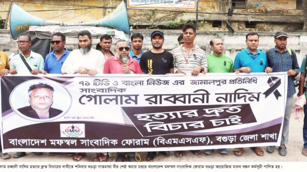 তারই ধারাবাহিকতায় বগুড়ার সাতমাথায় শনিবার ১৭ জুন সকাল ১১ টার দিকে বাংলাদেশ মফস্বল সাংবাদিক ফোরাম (বিএমএসএফ) বগুড়া জেলা শাখার আয়োজনে মানববন্ধন কর্মসূচী পালন করা হয়েছে।