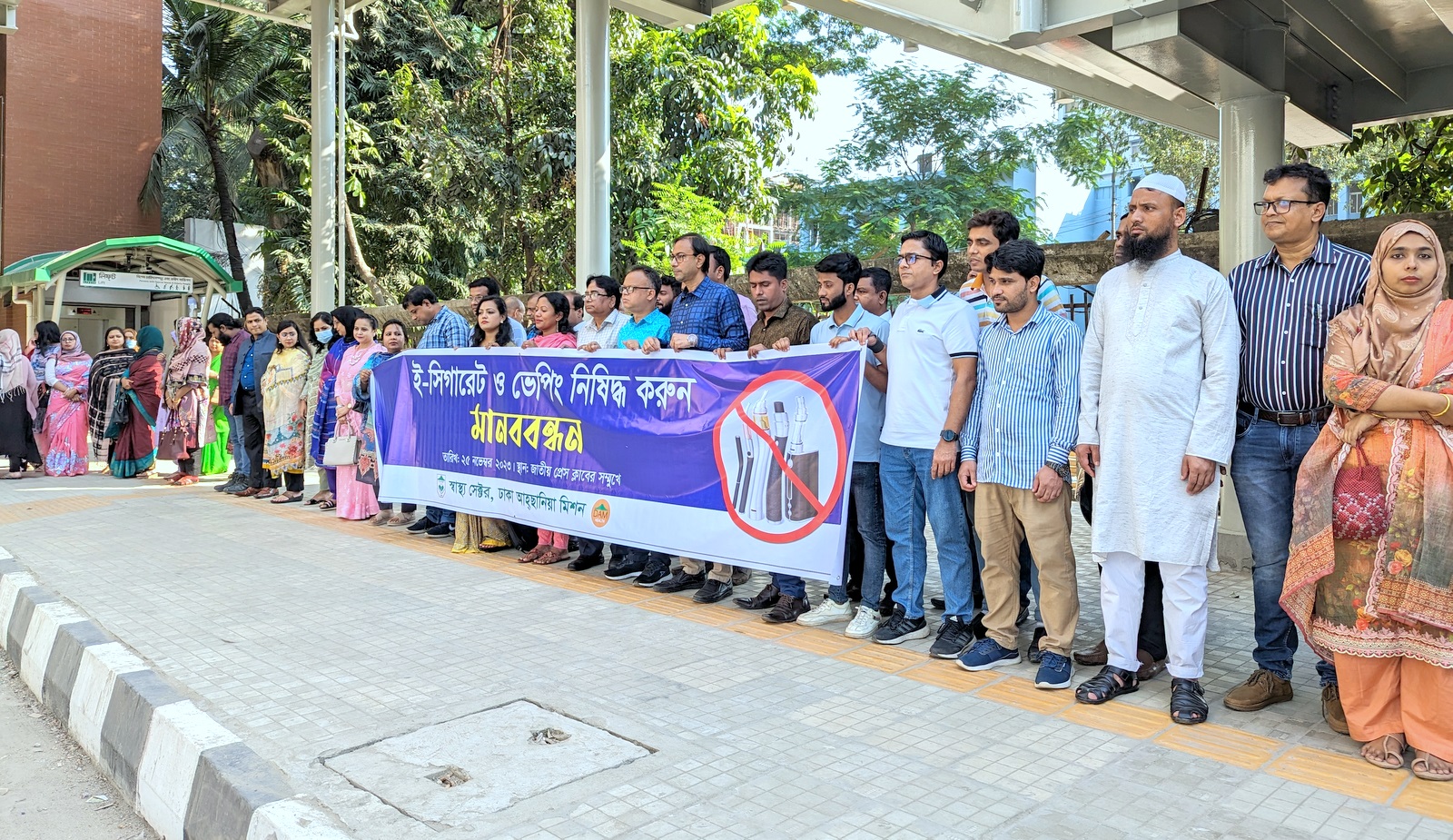 মানববন্ধনে বক্তারা বিশ্ব স্বাস্থ্য সংস্থার উদ্বৃতির বরাত দিয়ে বলেন, ই-সিগারেটসহ সকল ইমার্জিং টোব্যাকো প্রোডাক্টকে স্বাস্থের জন্য মারাত্নক ক্ষতির পণ্য হিসেবে চিহ্নিত করেছে বিশ্ব স্বাস্থ্য সংস্থা। এমনকি, ই-সিগারেটকে তামাক পণ্য ব্যবহারের গেটওয়ে হিসেবেও উল্লেখ করা হয়েছে। ক্যান্সার সৃষ্টিকারী উপাদানও বিদ্যমান এই ই-সিগারেটে।